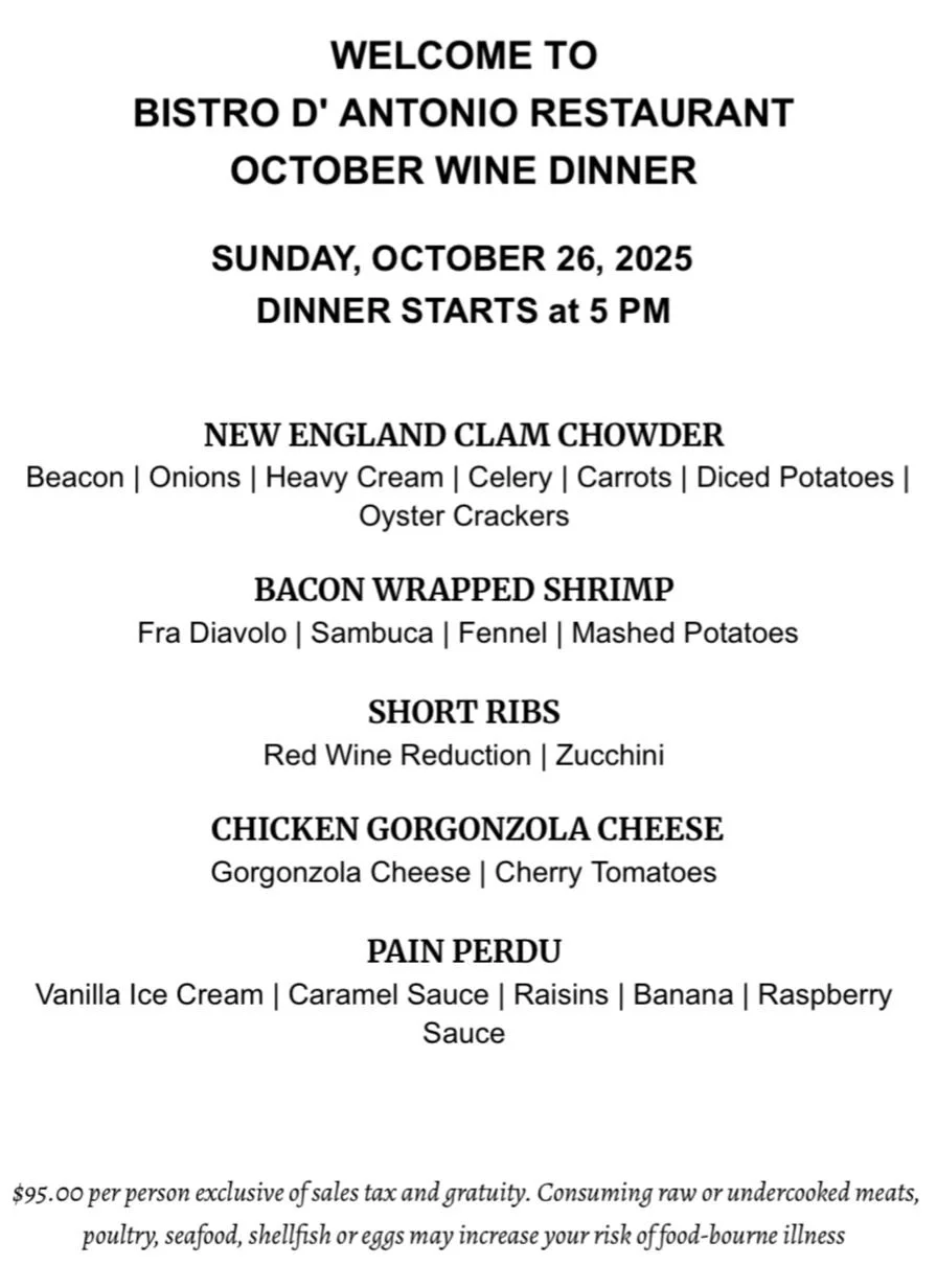 OCTOBER WINE DINNER HERE IS OUR WINE DINNER MENU call 704.243.0633 or email us at info@bdantonio.com to reserve your spot Paulo FernandezOctober 4, 2025 Facebook0 Twitter LinkedIn0 Reddit Tumblr 0 Likes